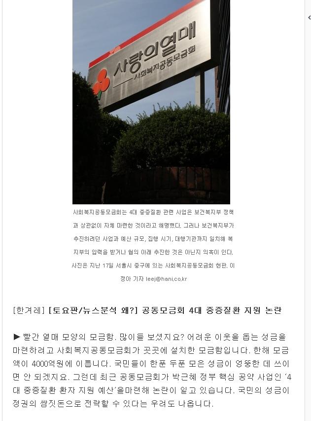 사회복지공동모금회가 정보공개, 운영비 비율 이런 측면에서 그래도 믿을만한걸로 알고 있습니다. 물론 어느 자선단체나 감시와 견제가 있어야겠지만, 어느정도 신뢰해줄 필요도 있다고 봅니다ㅎㅎ |