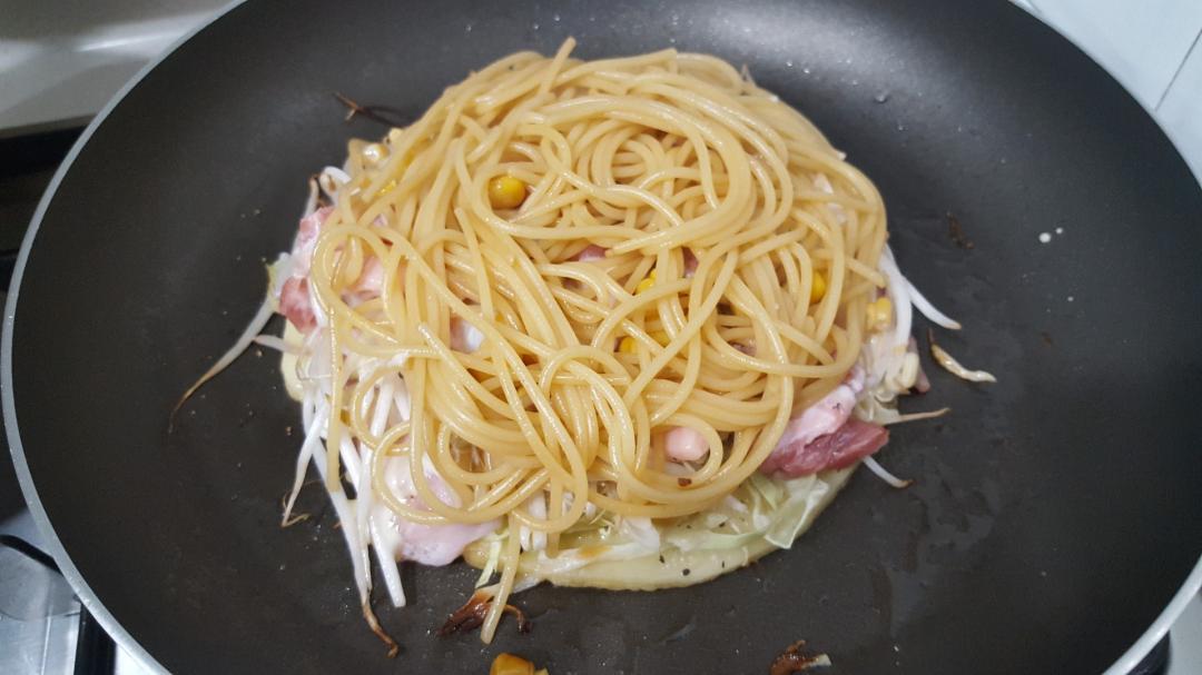 속재료는 양배추,숙주,베이컨, 문어 조금, 스파케티면, 계란1알 이렇게고요~