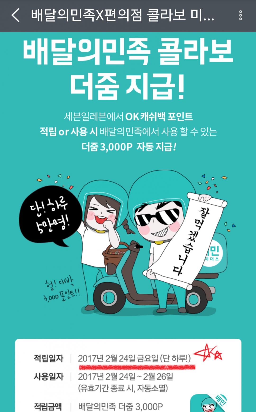 세븐일레븐에서 ok캐시백 적립 또는 사용시 배달의 민족 미리줌 3000p 자동으로 적립된답니다.