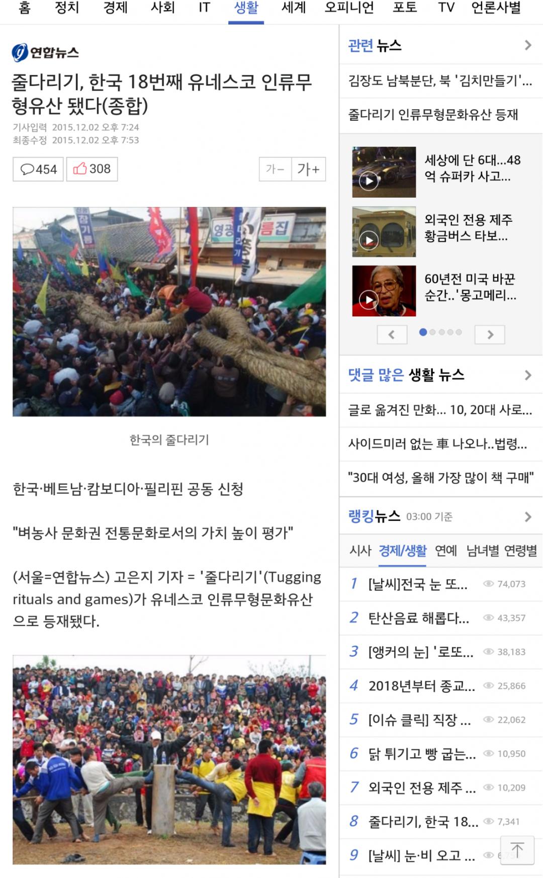 이로써 한국은 2001년 종묘제례 및 종묘제례악을 시작으로 강릉 단오제(2005), 강강술래, 남사당놀이, 영산재, 제주칠머리 당영등굿, 처용무(2009), 가곡, 대목장, 매사냥(2010), 택견, 줄타기, 한산모시짜기(2011), 아리랑(2012), 김장문화(2013), 농악(2014)과 함께 인류무형문화유산 18건을 보유하게 됐다.