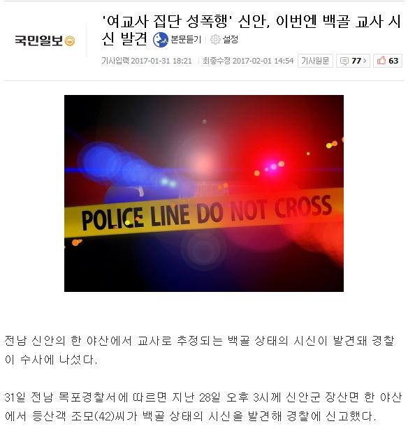 신안 교사는 목을 맨 상태로 발견되었다고 하네요. 집을 나오면서 가족들에게 '미안하다'라고 문자를 보낸 것도 그렇고, 자살로 추정하고 있다고 하던데.. 어떻게 결론났는지는 모르겠습니다. |
