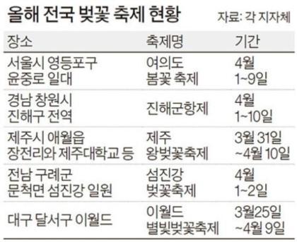 3. 벚꽃, 개나리 축제 → 진해 군항제 31일 ~4.10. 서울 응봉산 개나리 축제 31일 ~4.2.(문화)▼주요 벚꽃축제