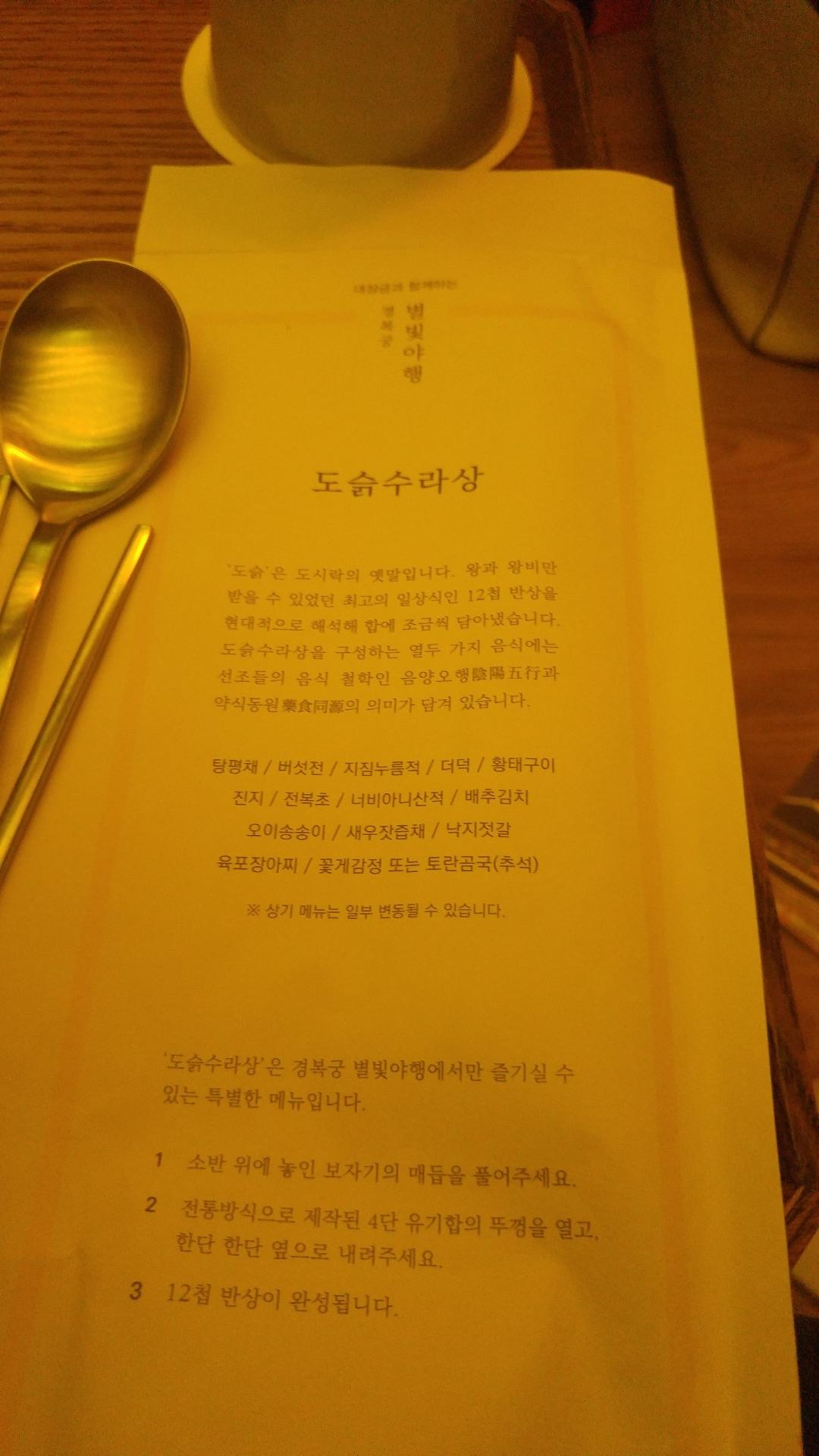1인당 5만원이라 비싸긴 하지만 저녁도 잘나오고 안내하시는 분들이 친절하게 설명도 해줘서 몰랐던 것들도 많이 알게되서 좋았어요.그리고 평소에 못가보던 곳들도 들어가볼수 있고 제일 메인은 출입금지 구역인 경회루에 가봤던게 가장 좋았어요. 거기서 대금연주해주시는데 경회루에 앉아 대금 소리듣구 있으니 마음이 편해지더라구요.