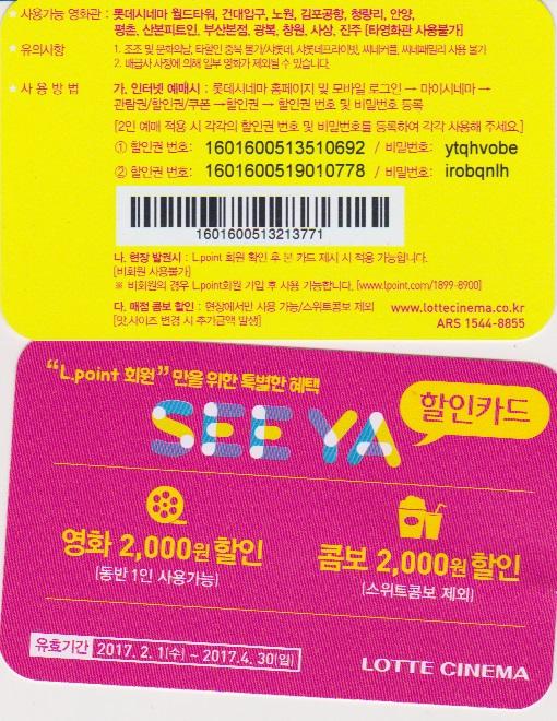 롯데시네마 12개 상영관 예매시 장당 2000원 할인돼요.