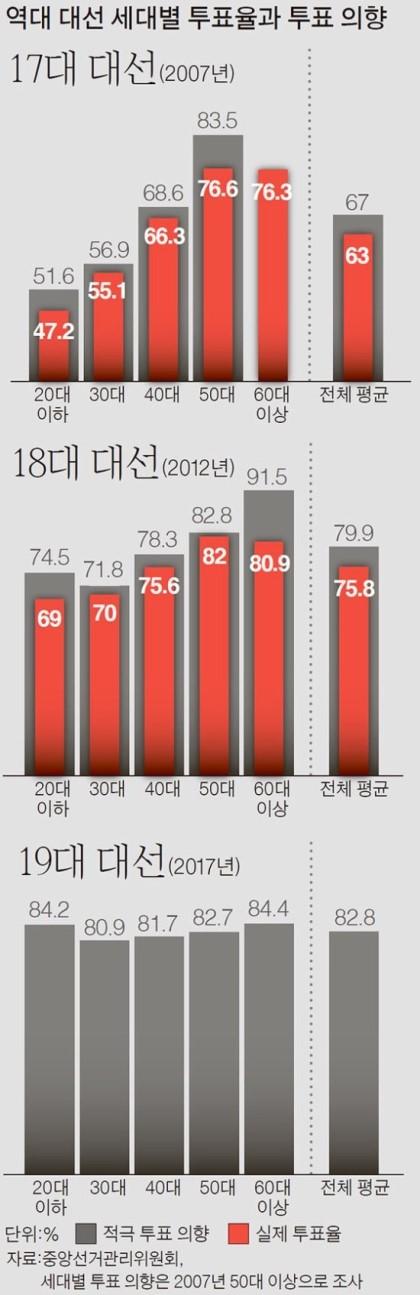 5. 20, 30대 적극 투표 의향 → 지난 대선보다 10%P 높아. 전체 유권자는 5060이 2030보다 400만명 많아.(중앙)▼