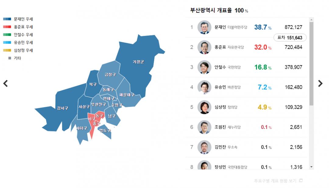 대체적으로 부산도 문재인 후보가 압도적이긴 아니지만 우세 했습니다..