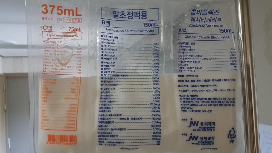콤비플렉스는 식사못하는 환자.. 가령 식도가 녹아서 입으로 못넣는다거나 의식없어 경구섭취 안되는 환자만 장외영양으로 보험급여 되구 일반적으로 음식 섭취 되는 환자 맞길 원하면 비보험으로 비싸요 ㅋ 일반적인 비타민 영양제랑 달라요~ 포도당용액에 비타민 섞은건 비보험해도 만얼마정도 |