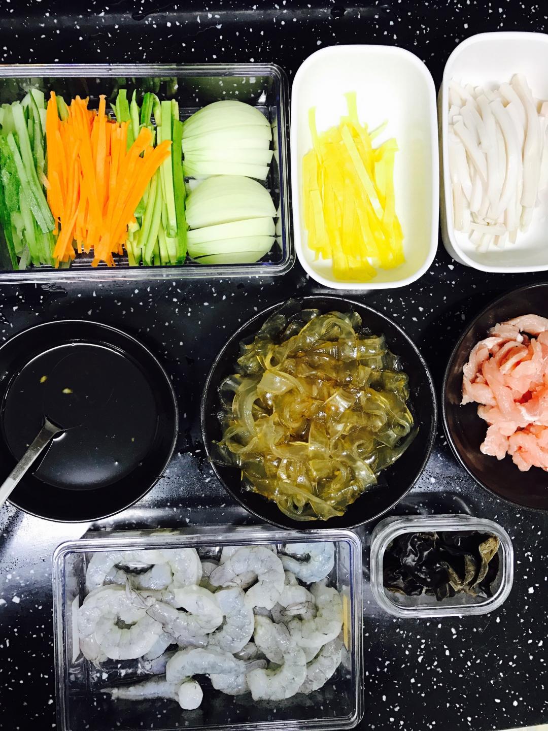 다음, 불려놓은 양장피 데쳐서 밑간해두고, 잡채용고기 밑간하고 전분가루 넣어서 쫄깃하게 만들고, 고기와 재료들 볶다 간장 양념장 넣어 볶아줘요.