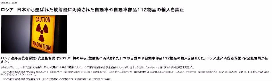러시아 연방 소비자 보호 안전 감독국에 따르면, 일본 측에 방사능에 오염 된 중고차 및 자동차 부품이 일본에서 가져온 있으며, 적절한 조치를 취할 필요가 있다고 지적하고있다 하지만, 지금까지 방사능에 오염 된 일본 중고차 수출에 대해 일본 측이 대책을 강구했다는 정보는 들어오고 있지 않다고한다.