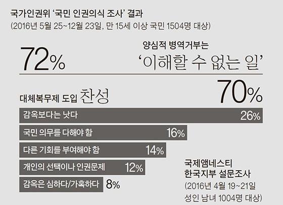 2번 분석을 중앙이 왜 저렇게 해석하는지 이해가 안 가네요. 감옥이 군대보다 낫다는 양심적 병역거부자들의 선택은 이해가 안 가지만, 그들이 존재하는 이상 감옥말고 다른 방법이 필요하다는 전혀 상충될 것 없는 인식인 것 같은데요.