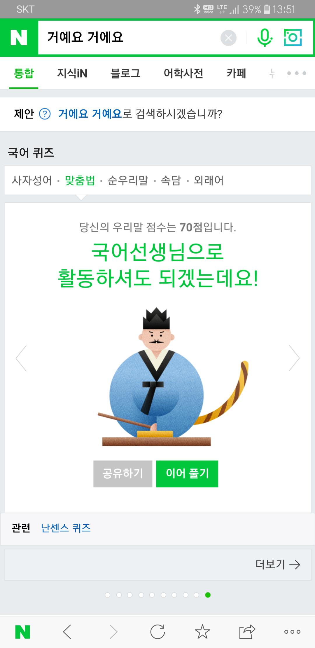 네이버 맞춤법 퀴즈하는데 70점 나왔네요.