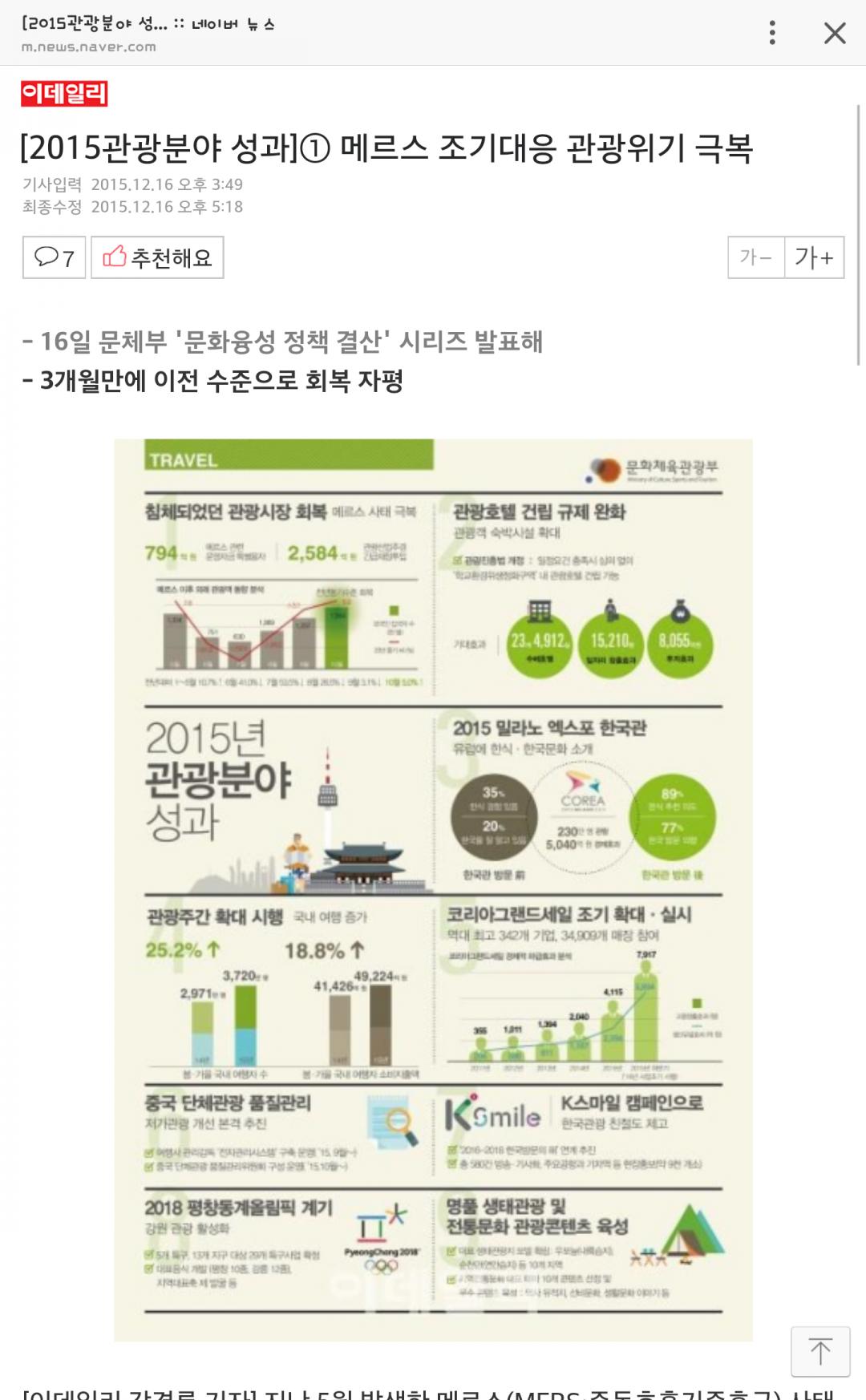 지난 5월 발생한 메르스(MERS·중동호흡기증후군) 사태 적기 대응을 올해 관광 부문에서 가장 큰 기억에 남는 성과 중 하나로 꼽혔다.