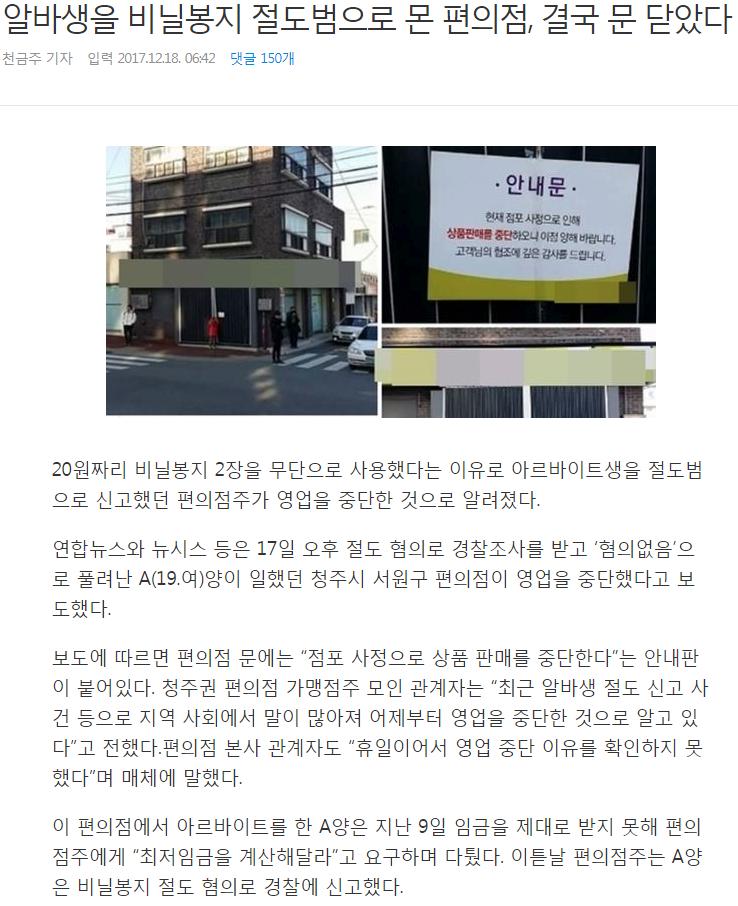 청주에서 발생한 일이라는데.. 19살 아르바이트생이 최저임금을 제대로 계산해달라고 요구한걸로 알바생이 과자를 구입 후 비닐봉지 사용한걸로 절도 신고를 했다는데.. 점주가 인간이 아니라는 생각이 드네요.. 아마도 편의점에서 비닐봉투 무상으로 주면 벌금 받는다고 손님에게 20원씩 받는 그 금액인거 같은데 세상에 얼마나 째째하고 웃기는 쥔장인지 면상이 궁금하네요...