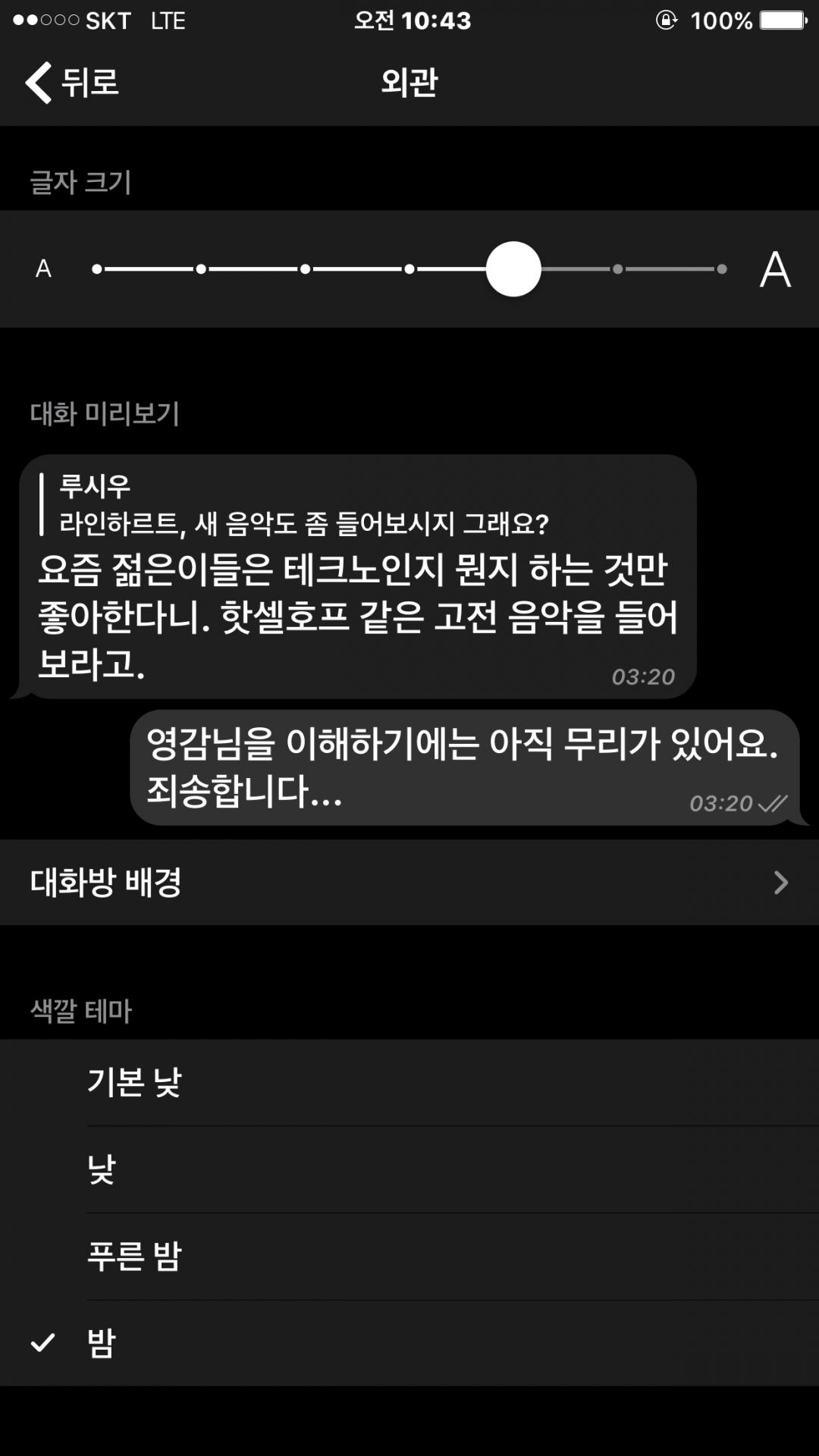 낮 테마가 아이폰 아이메세지 색이랑 같아서 좋네요 ㅋ |