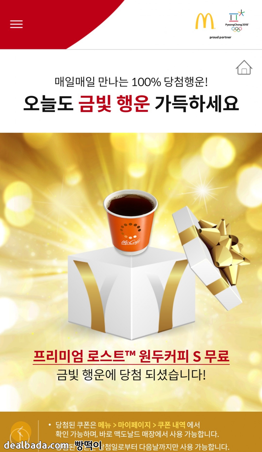 처음 도전했던 30일날 접속안되어서 안했었는데 이글 보고 해보니 원두커피 당첨이네요! 그리고 30일 접속장애 보상인 후렌치후라이쿠폰도 들어있는거 덕분에 확인했어요ㅎㅎ감사합니다 내일 둘 다 써야겠네요 |