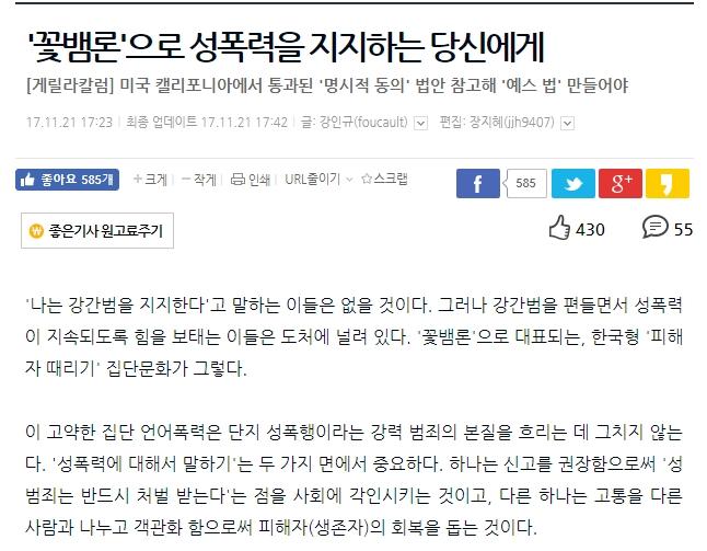 기사를 읽어보시긴 한건지요. 저도 그 누구를 강간하거나 추행해본적 없습니다. 근데도 사회 통념상 불과 몇년전만해도 여자에게 순결을 강요하던 사회니, 그로인해 추행을 당하거나 폭행을 당해도 경찰에 신고도 못하고 혼자 정신치료받고 고통 받는 여성들수가 꽃뱀으로 인해 희생당한 남자들 수보다는 훨씬 많다고 봅니다.꽃뱀으로 피해보는 남성의 입장에 침묵하자는 소리가 아니라, 우선은 먼저해결해야 하는 공통의 문제가 아닐까 싶네요. 이 문제를 집단간에 양보하고 이기심 부리는 문제라고 보는건 옳지 않다고 봅니다. |