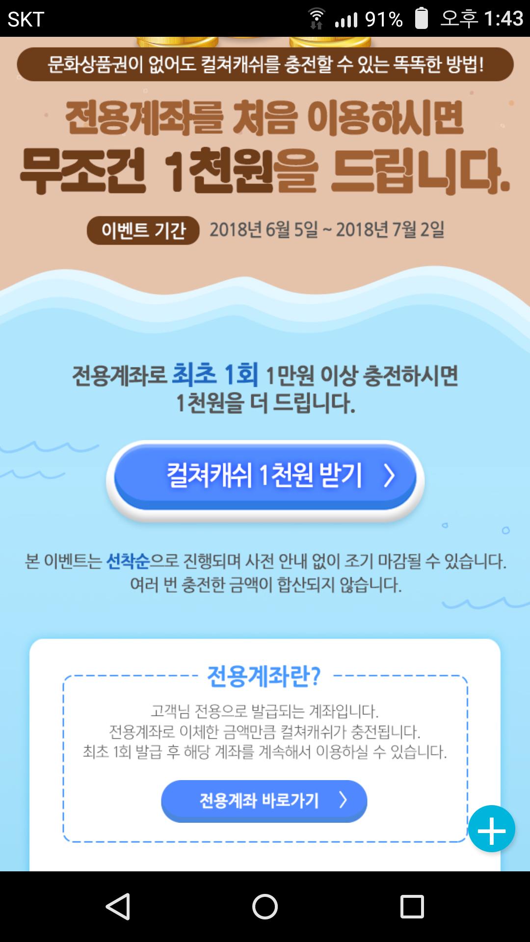 ㅁ 1만이상 전용계좌에 송금시 5%컬처캐쉬적립해줌
