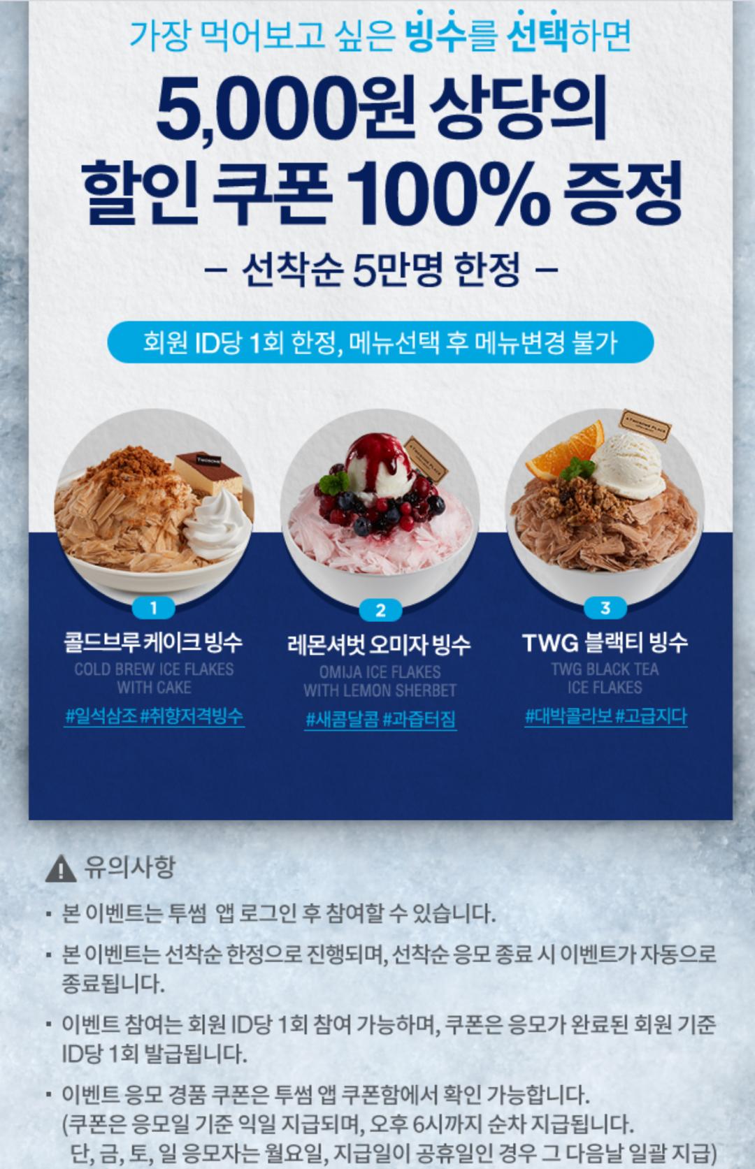 선택한 빙수는 3000원, 나머지는 1000원씩 할인되는 쿠폰이 지급된다네요 ㅠㅠ