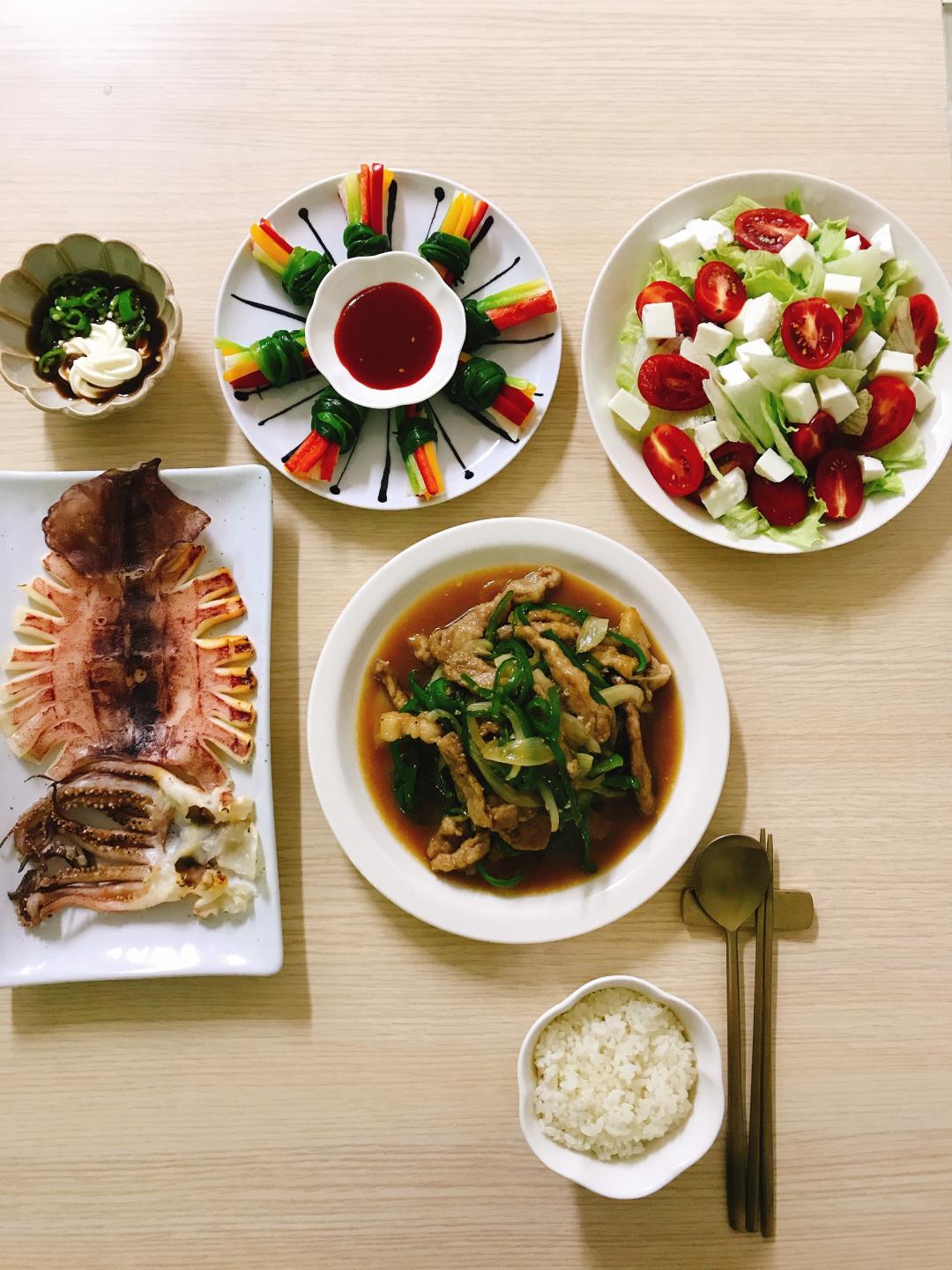 고추잡채 와, 쪽파숙회, 양상추샐러드 와, 반건조 오징어 입니다!