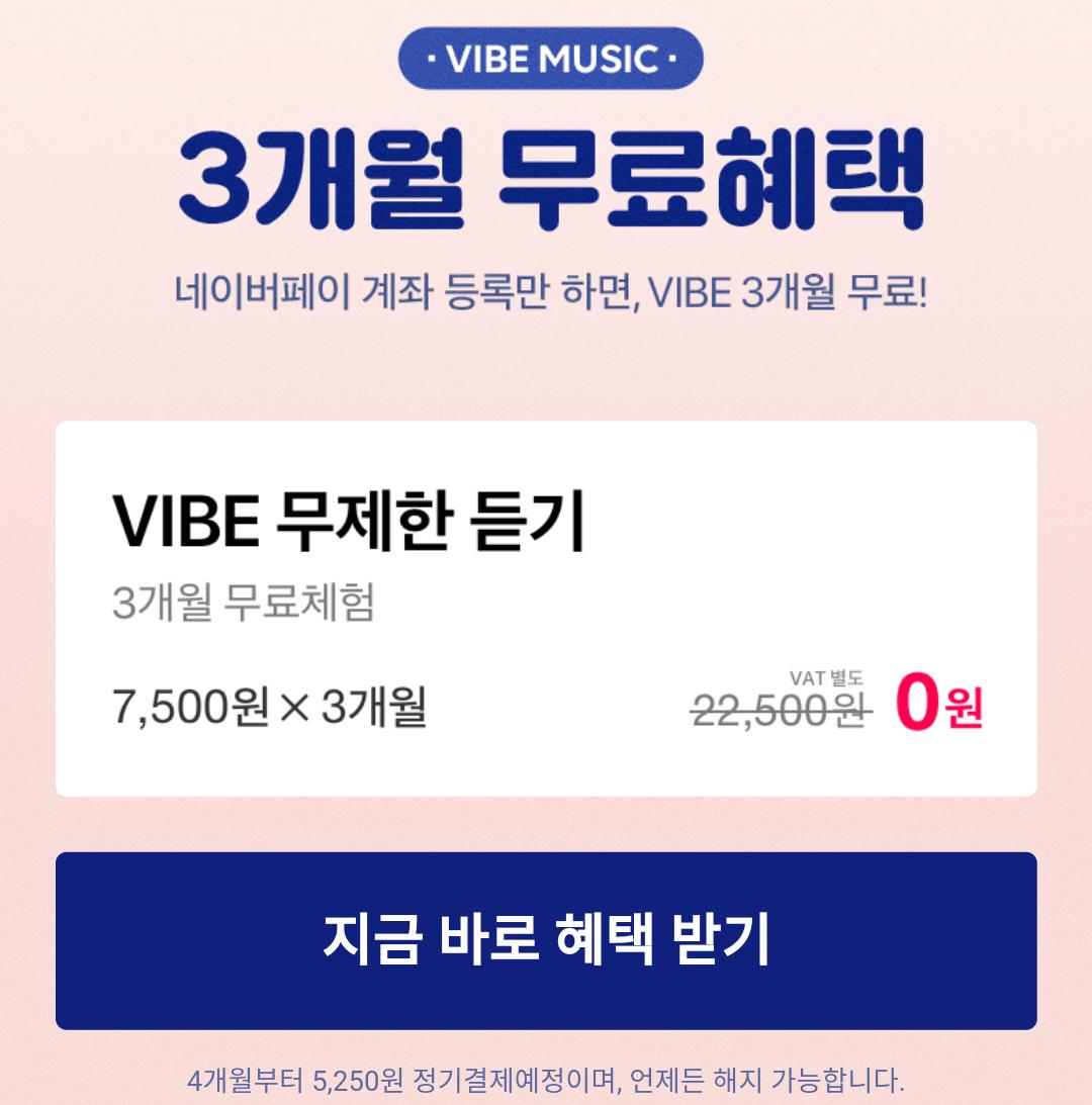네이버페이 은행계좌등록 후 3개월 무료 혜택 상품의 경우 VIBE 뮤직이용권 구매 시에 3개월 무료 혜택을 제공하는 상품입니다.