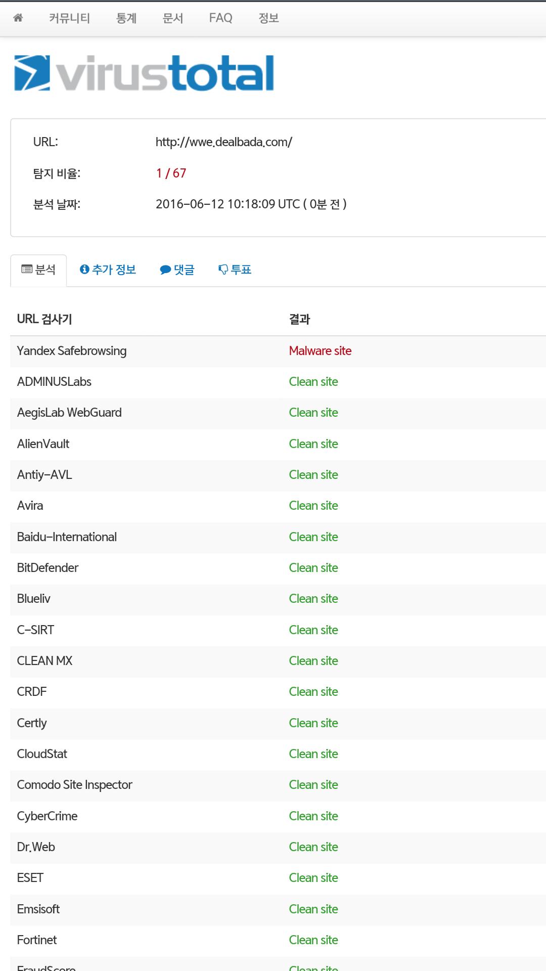 보시는 것 처럼 얀덱스만 악성코드 있다고 탐지합니다