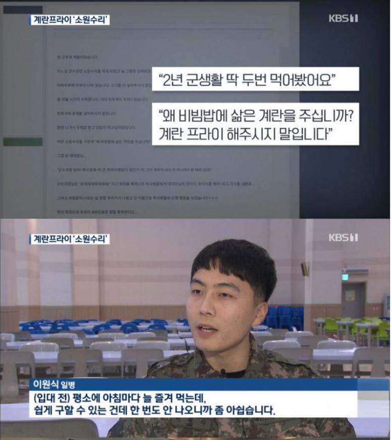 이런건 꼭 국방부와 가까운 상급부대에서만 하는거 같더군요. 강원도 산골짜기에 박혀있는 부대들이 저런 소원수리 했다는 소리 단 한번도 못들어봤습니다. 국방부에서 군복무에 대한 인식변화로 저런짓 하는거 같아요.'2019국방부 메뉴 추가'라는거보니 그냥 원래 언론 노출하려고 계획했던거 계란후라이 좋아하는 사람들중 언론 노출해도 되는 병사들 뽑아 방송 내보낸거겠죠. |