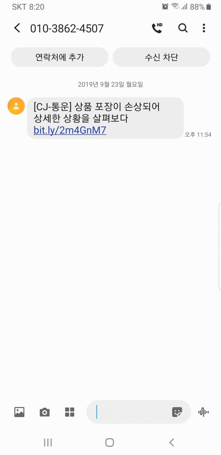 보통 평소에 저렇게 간단하게 택배문자가 오지도 않고 게다가 한번도 우편번호가 잘못되었다는 문자 받아본적이 없어서 받자 마자 의심이 들더군요