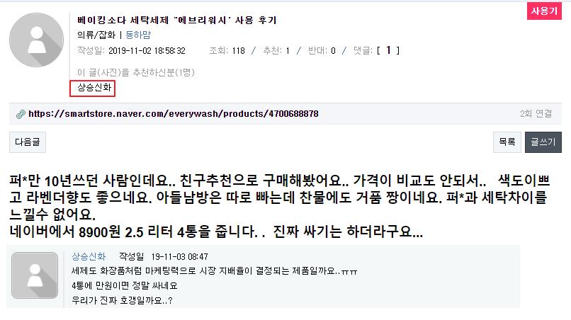 2 동하맘은 첫글이 에브리워시 링크를 넣은 사용기+상승신화의 추천 이상하단 댓글 달리니 삭제
