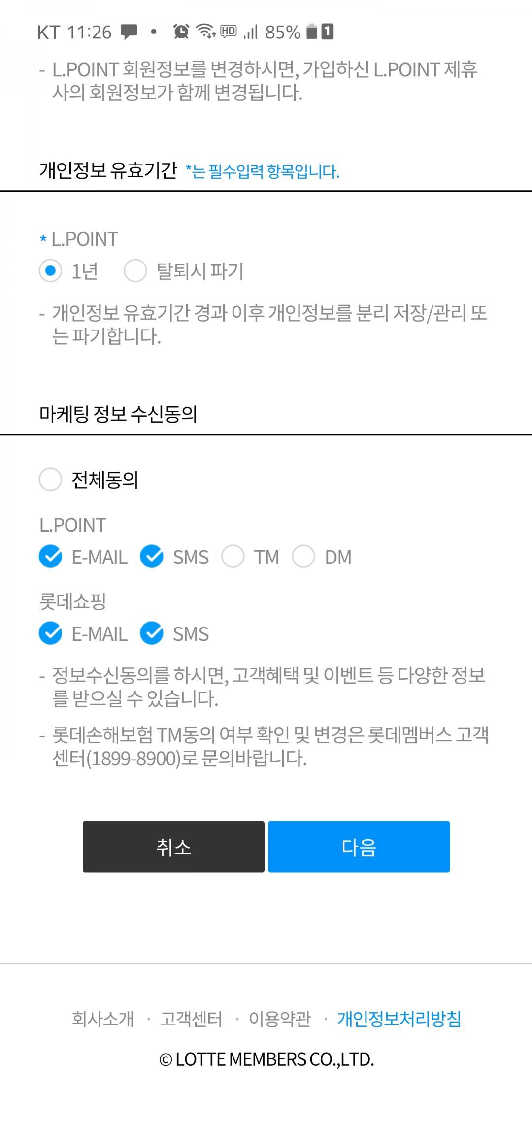 선택이 쿠폰 신청할 때 나오던 건가요? 쿠폰 신청할 땐 아마 다 동의했을 거에요 위 이미지는 엘롯데 마이페이지에서 확인한거구용