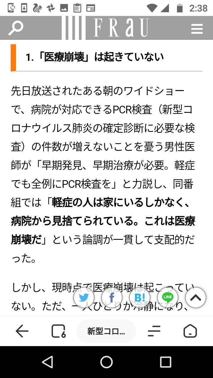 요전날 방송된 어느 아침의 와이드 쇼에서, 병원이 대응할 수 있는 PCR검사(신종 코로나 바이러스 폐렴의 확정 진단에 필요한 검사)의 건수가 증가하지 않는 것을 걱정하는 남성 의사가 "조기 발견, 조기 치료가 필요. 경증이라도 전례로 PCR 검사를"이라고 역설했고, 같은 프로그램에서는 "경증인 사람은 집에 있을 수밖에 없고, 병원에서 버림받고(치료 못 받고) 있다. 이건 의료 붕괴다라는 논조가 일관되게 지배적이었다.
