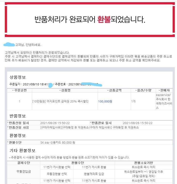 머지 포인트 11번가에서 구입한분들 환불 됩니다.