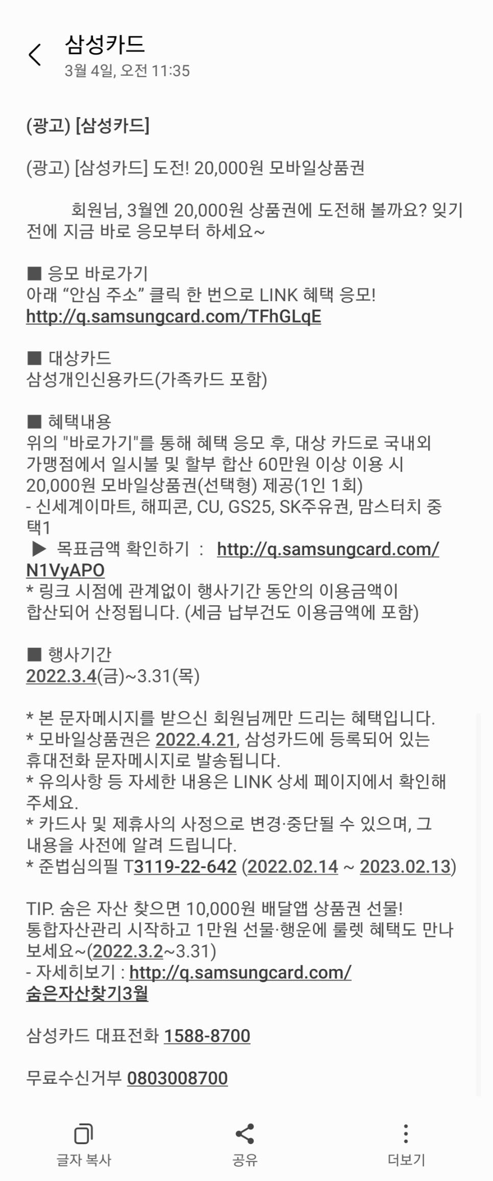 아까 문자확인하다가 봤는데 링크주소로 Link하신다음에 삼성카드로 60만원 이상 사용하시면 선택형 상품권 2만원어치를 증정해준다고 하네요~