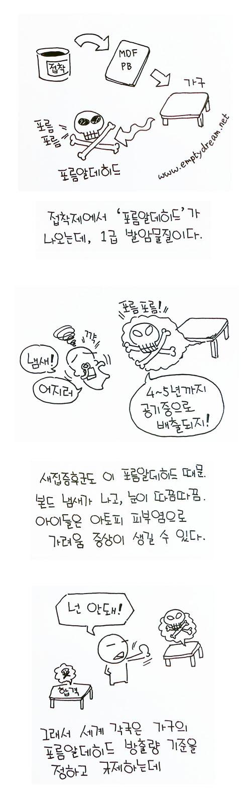 1) 중저가 가구에서 주로 사용하는 MDF/PB는 나무 부스러기와 접착제를 섞어서 목재로 만드는 방식인데, 여기서 사용된 접착제에서 '포름알데히드'라는 1급 발암물질이 나온다.