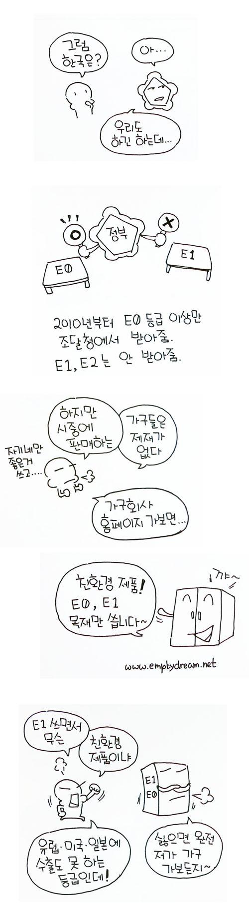 5) 한국의 가구시장에 나오는 가구들은 딱히 특별한 정부의 제재를 받지 않음(2015년 1월 현재). 그래서 이름 좀 알려진 가구업체에서는 주로 E1, E0을 사용함. 그리고 완전 저가 가구들은 E2를 사용하기도 함. (E2는 유럽, 미국, 일본 등에선 가구용으로 아예 사용하지 못하게 하는 등급)