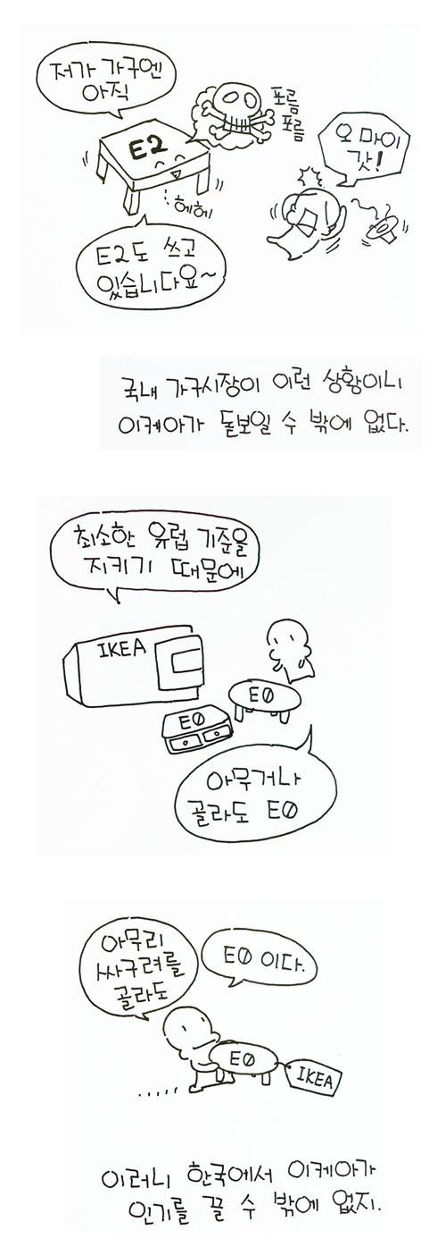 따라서 해외에서는 다 비슷비슷한 품질의 가구들 속에서 이케아가 그냥 저가의 이미지를 갖고 있지만, 한국에선 졸지에 친환경 등급 E0만 사용하는 품질 좋고 값 싼 가구가 돼 버린 상황이다.