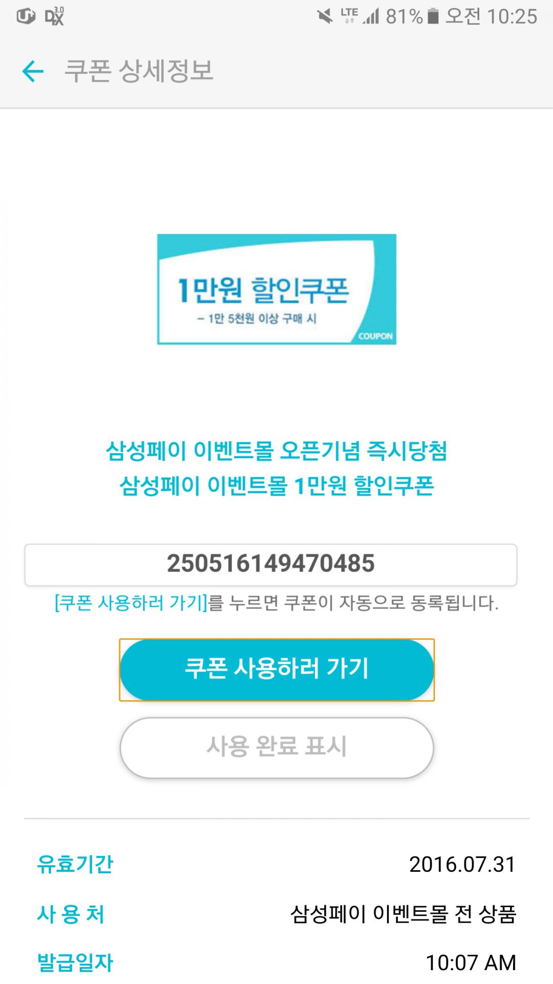 매일 1000명인데. 기간동안 삼성페이 한 10번넘게 써서 처음 1만원 당첨.