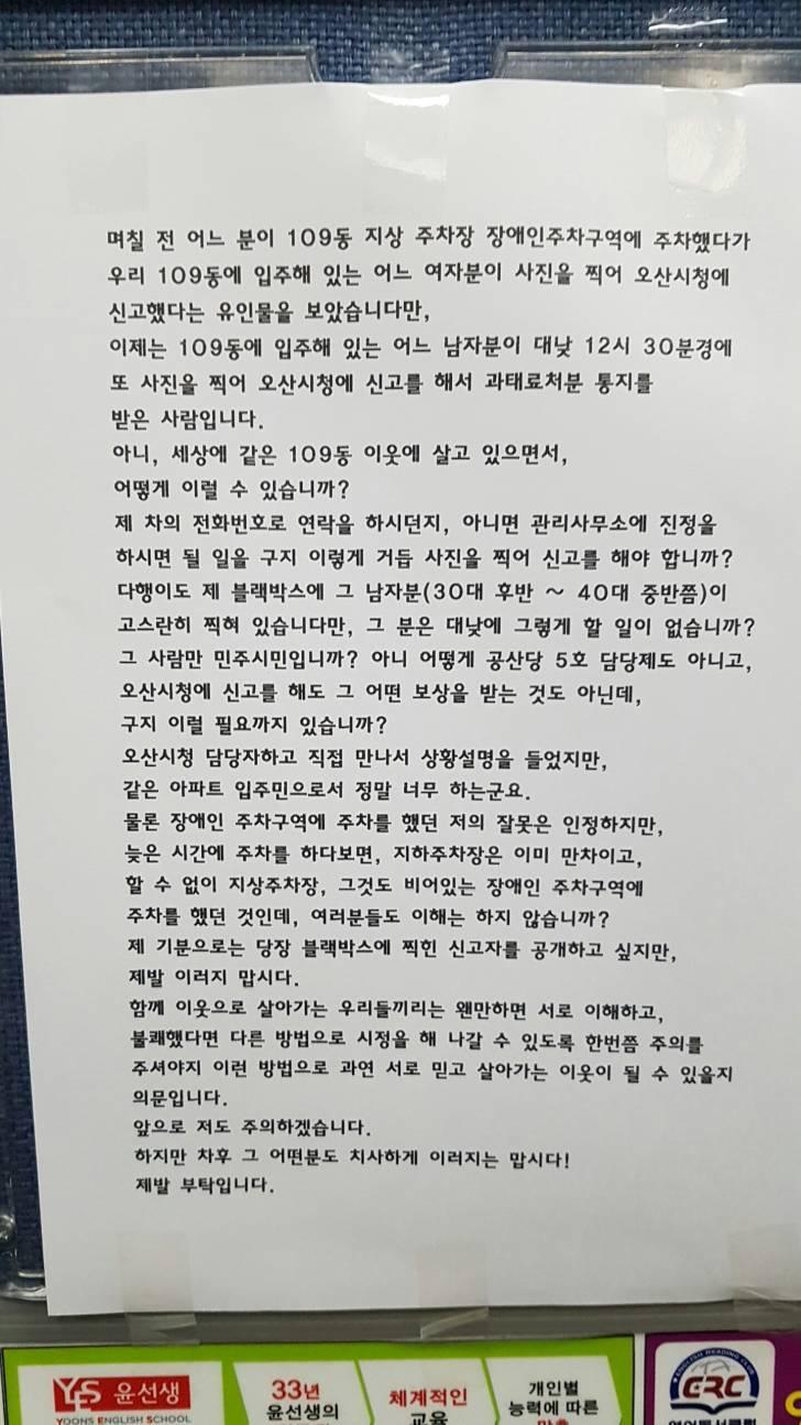 만약 저였다면 아주 재미있었을거 같네요. '저라면 장애인 흉내내는 뇌주름 없는 인간이 있어 참교육중입니다. 신경쓰지마세요' 라고 쪽지 붙였을듯.. |