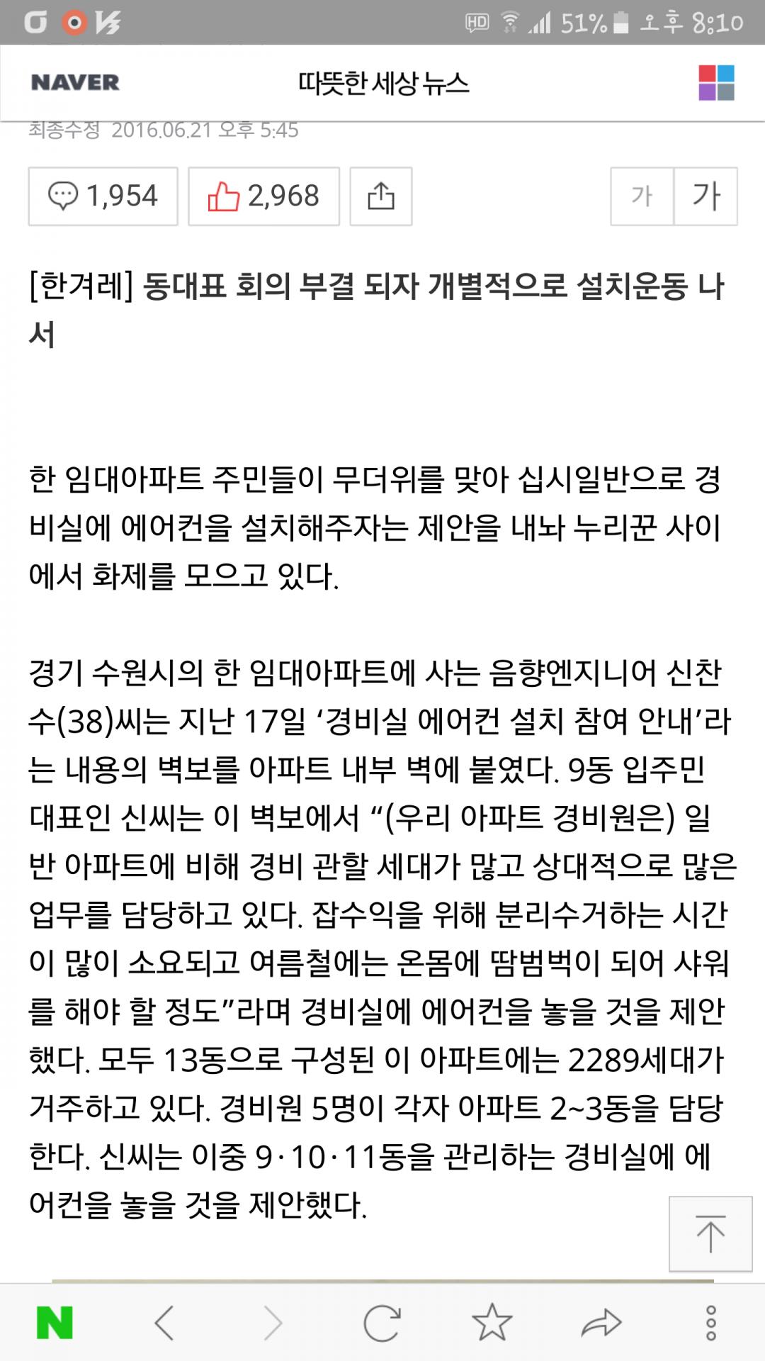 경비실에 에어컨 필요하긴 하죠. 동별로 모금해서 하던 관리비에서 하던 전국적으로 확대됐으면 좋겠네요~ 벽걸이 에어컨이야 전기세가 얼마 나오지도 않을꺼구요~ |