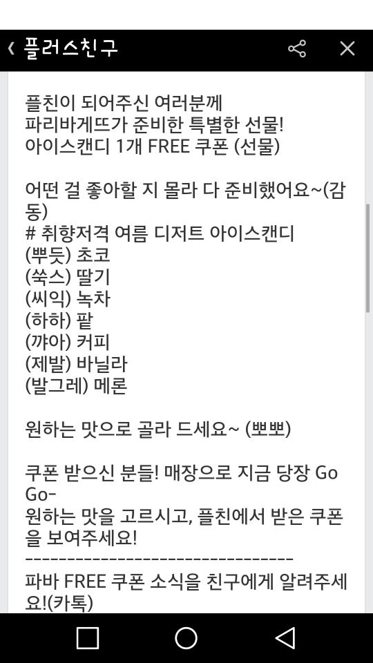 카톡 들어가서 파리바게뜨 플친 맺고 홈가서 소식 보면 아이스캔디 두개 받을 수 있어요