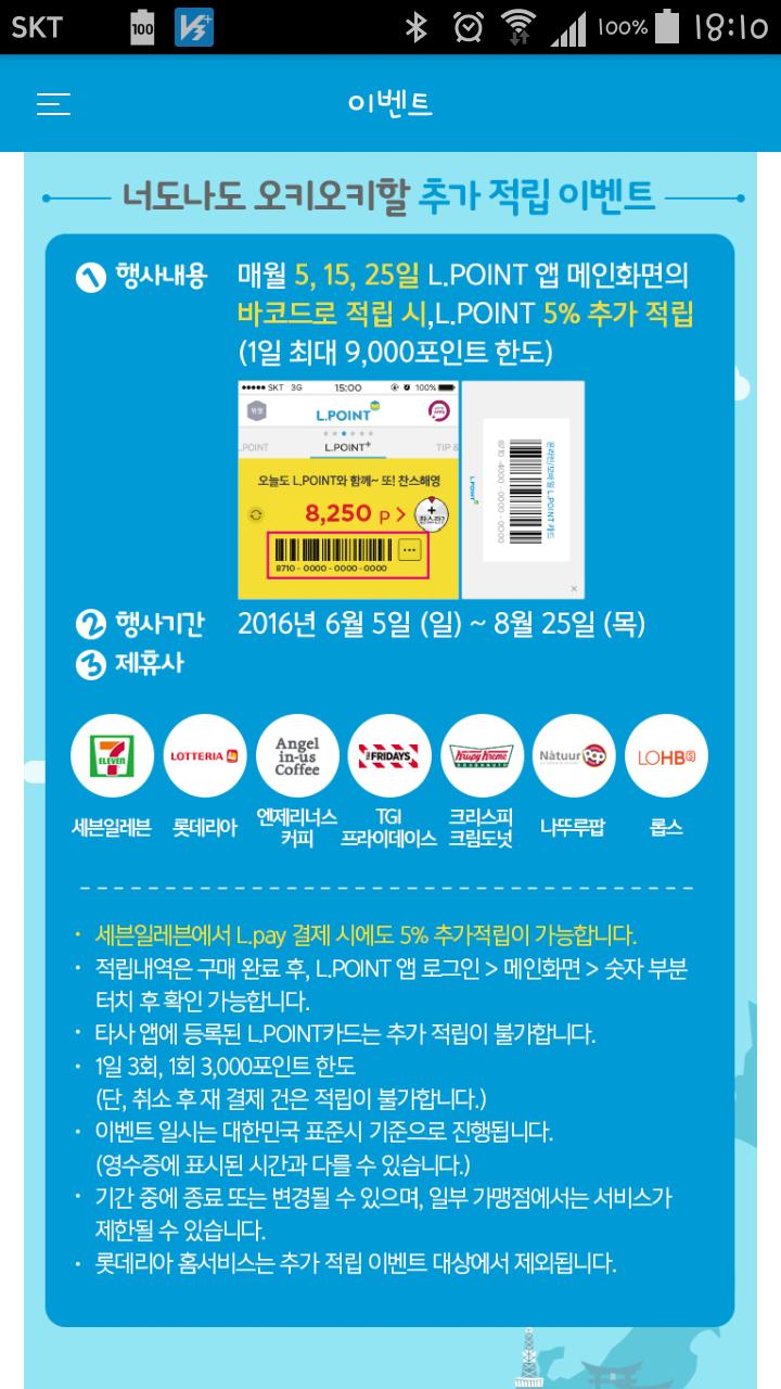 오늘은 오키오키 데이라고 매월 5일 15일 25일 L포인트앱에 있는 바코드로 적립시 L포인트가 1일 3회 1회 3천포인트 한도내에서 5% 추가적립 됩니다.