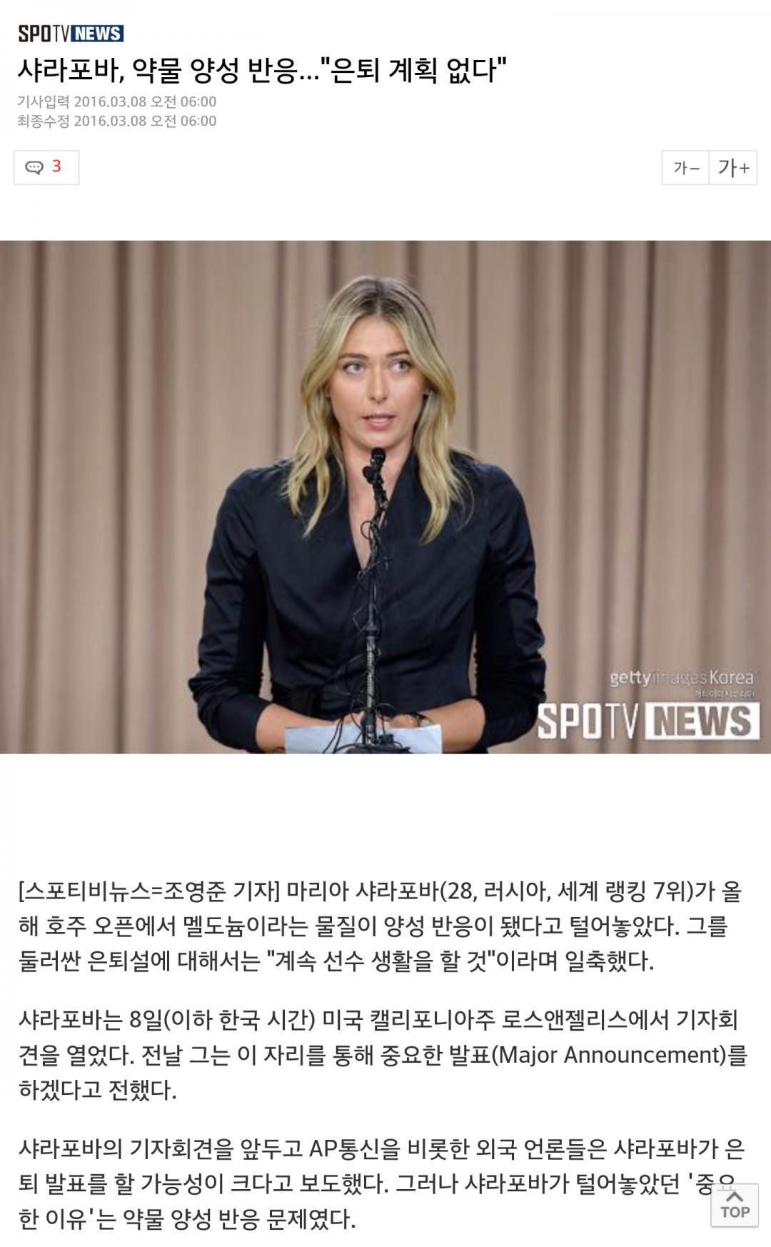 샤라포바는 8일(한국시각) 미국 로스엔젤레스에서 열린 기자회견에서 자신의 도핑 양성 반응 사실을 시인했다. 2016년 호주오픈 당시 실시한 도핑검사에서 멜도니움 양성 반응이 나왔다. 멜도니움은 심장병 치료에 쓰이는 약물로 샤라포바는 이를 10년째 복용해왔다. 올해 1월1일부터 새로이 금지약물로 지정됐고, 국제반도핑기구(WADA)는 이러한 내용아 담긴 레터를 지난해 12월22일 샤라포바측에 전달했지만, 샤라포바는 이 리스트를 보지 못했다고 밝혔다.