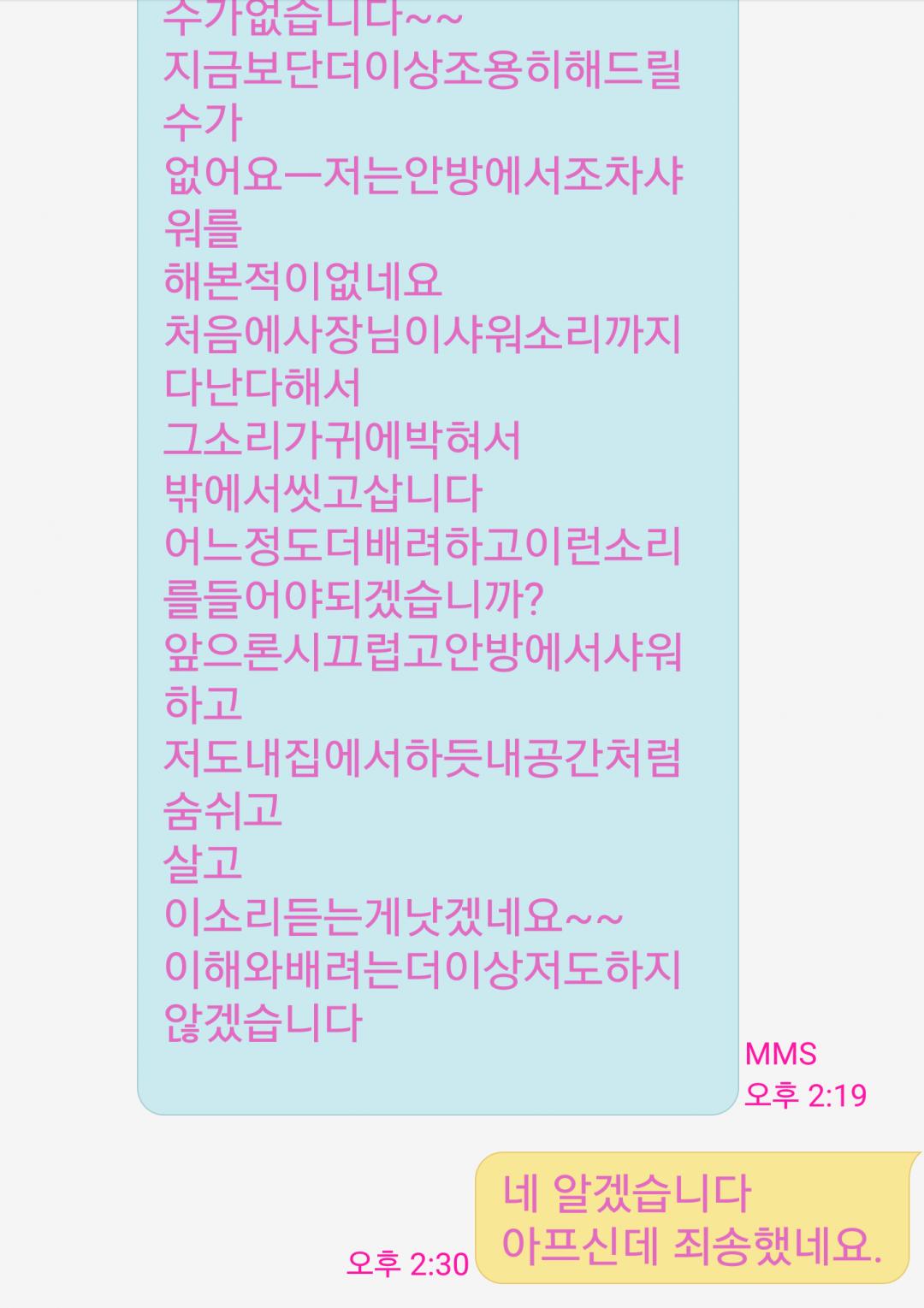 샤워부분은 전에 살던분들 말하면서 비유를 샤워소리도 다들릴정도로 층간소음이 심하다고 말한걸 나름 신경쓰셨나봅니다.