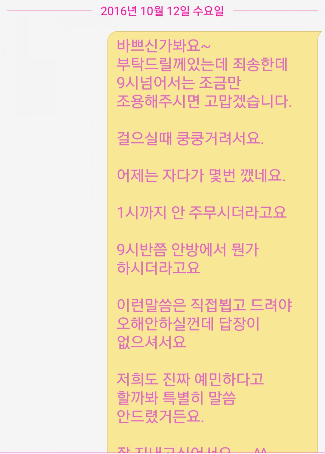 그동안 뛰는게 아니라서 참아왔는데 어제는 9시반부터 1시까지 잠을 자다가 몇번을 일어날 정도로 층간소음이 있어서 참고 오늘 낮에 최대한 정중히 문자를 보냈는데 전화가 오더니 다짜고짜 따지더니 화를 내더군요. 어이가 없었지만 줌마라서 참았습니다. 이런 성격이 아닌데 싸우기 싫어서요