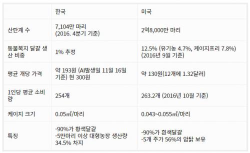 한국인들은 연간 1인당 254개의 달걀을 먹는다. 미국 계란 위원회에 따르면 미국인들은 이보다 조금 많은 263개의 달걀을 소비한다. 미국 내 가격은 개당 평균 130원으로 조류인플루엔자(AI)발생 이전 국내 가격인 193원보다 저렴한 편이다.