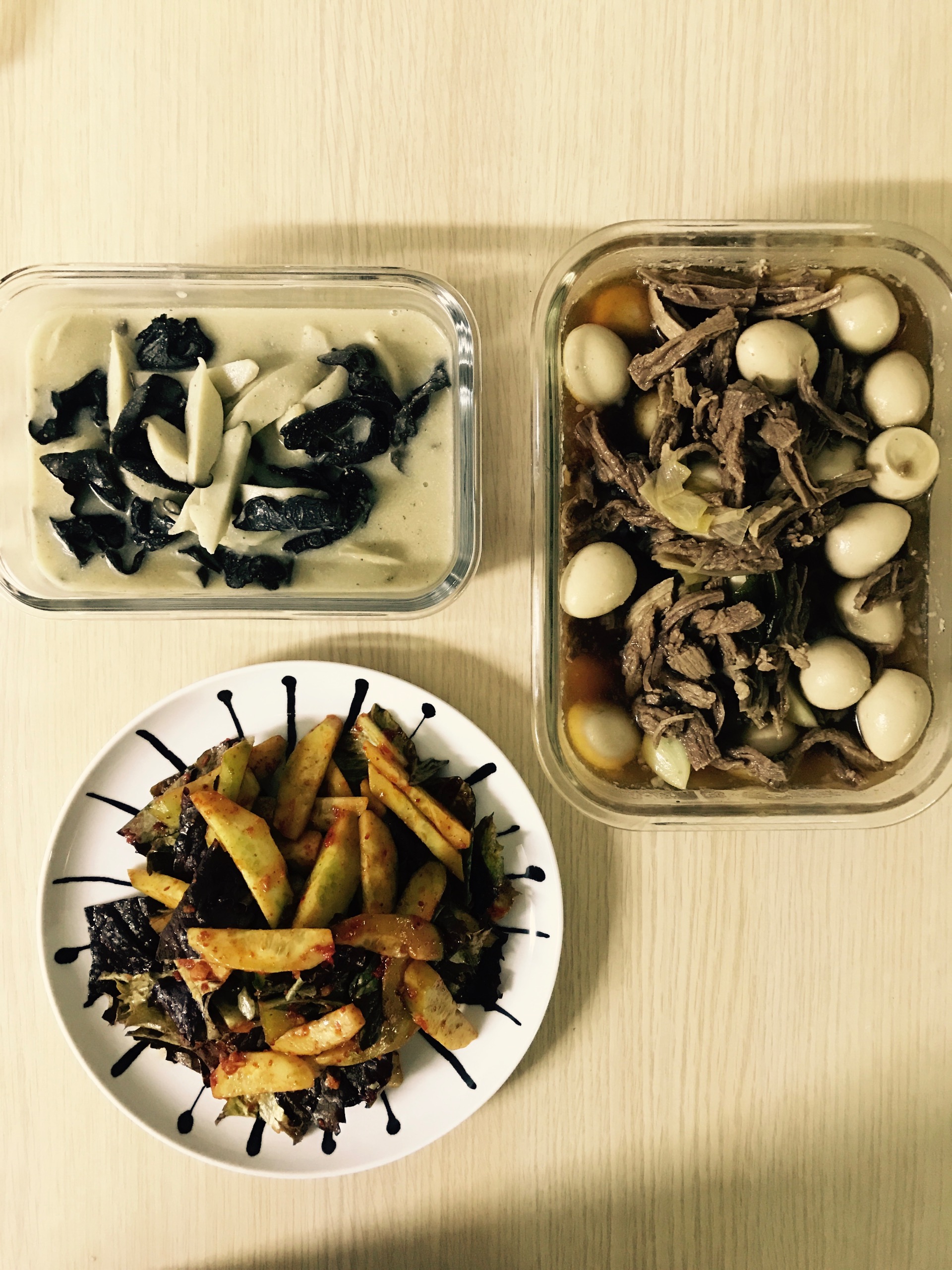 오늘 메뉴는 소고기미역국과 새송이,목이버섯넣고 걸쭉하게 끓인 버섯탕같은 버섯볶음, 소고기메추리알 장조림, 오이와 로메인 넣고 새콤하게 무친 오이무침이예요.