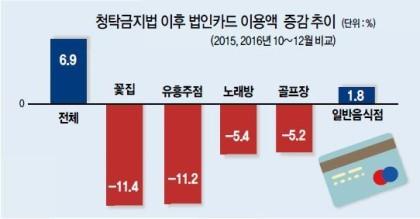 6. 김영란법 영향? 시행 석달 → 법인카드 총사용액은 증가했는데(6.9%) 꽃집(-11.4%), 유흥주점(-11.2%), 노래방(-5.4%), 골프장(-5.2%)은 감소. 일반식당, 골프장 개인카드는 8% 증가.(헤럴드경제)