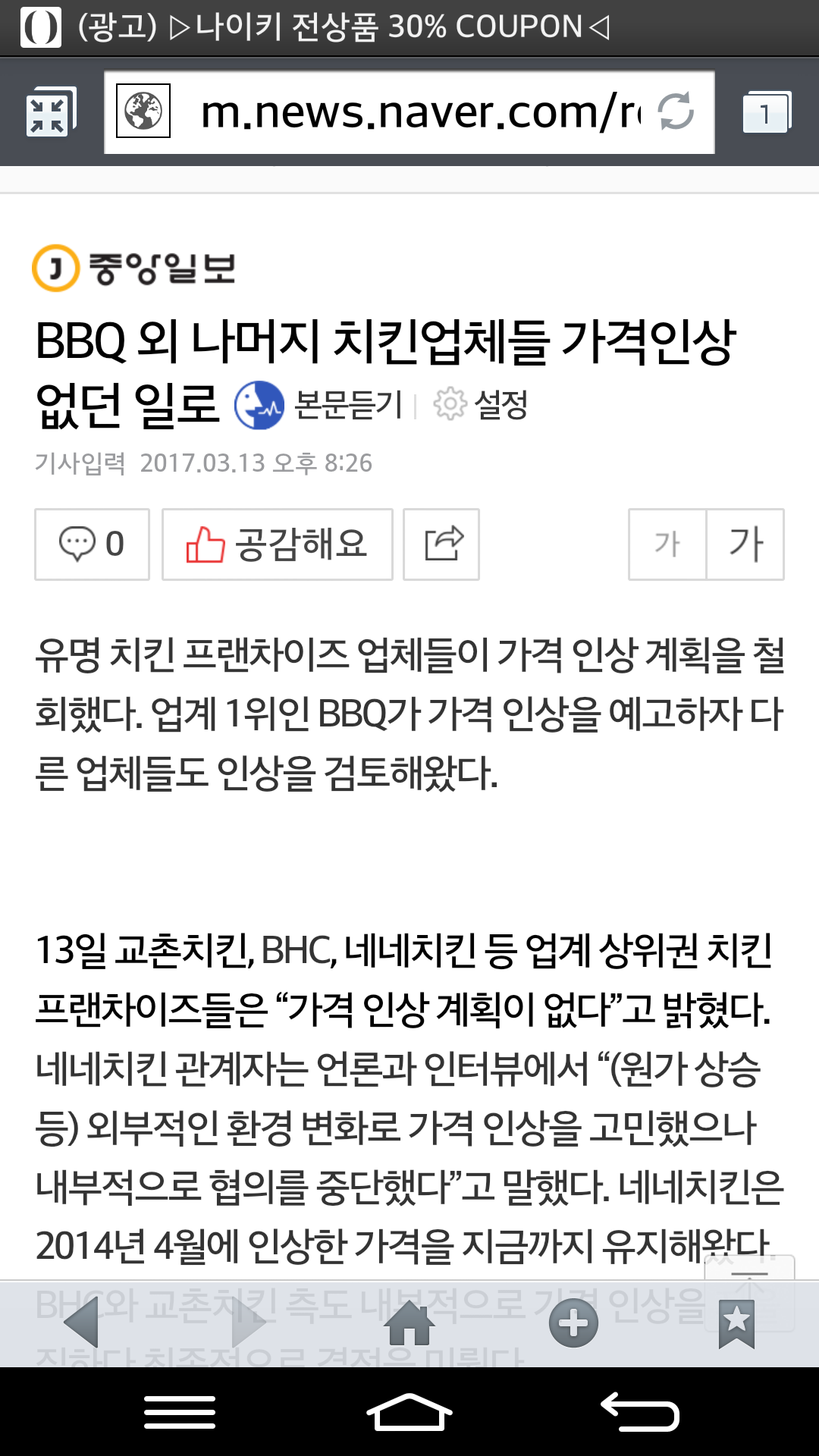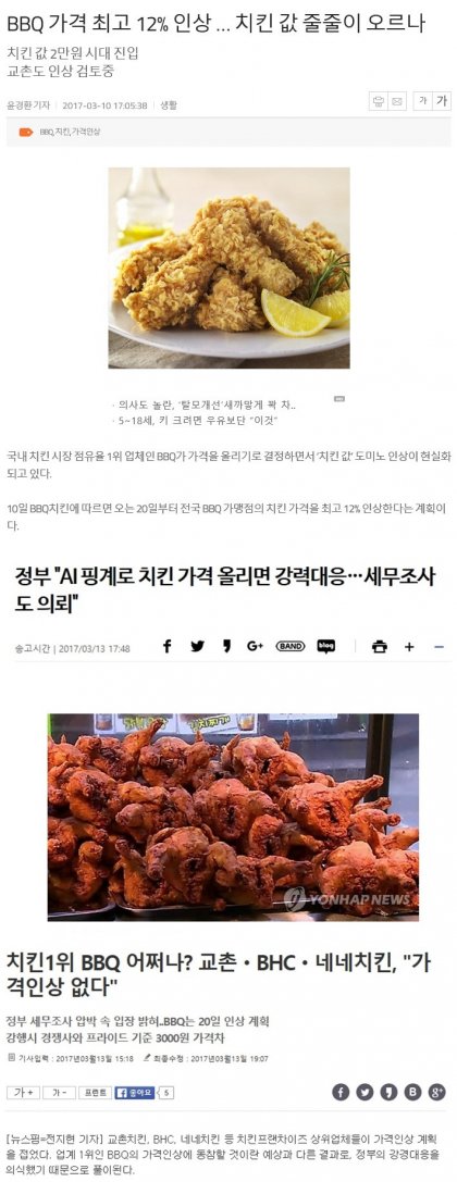 비비큐가 항상 치킨값 인상에 앞장서 왔던거 같네요 |