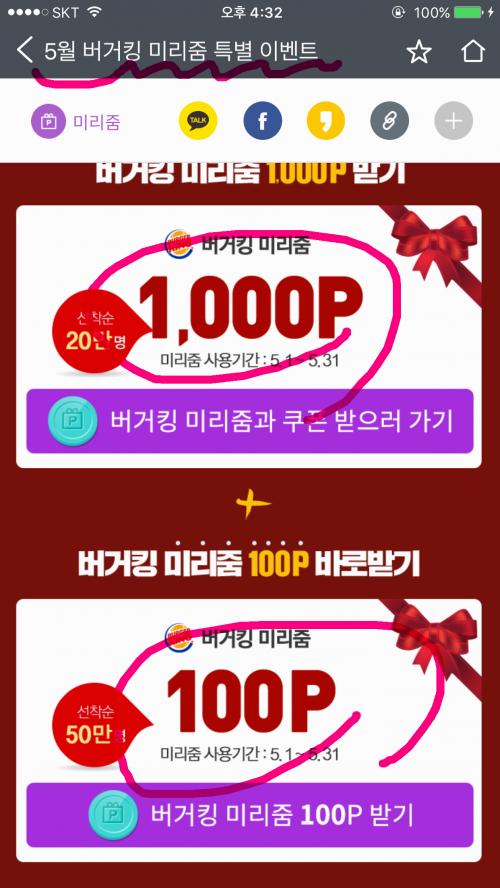 OK캐시백앱에 버거킹 미리줌 1,000점+100점 챙겨가세요~