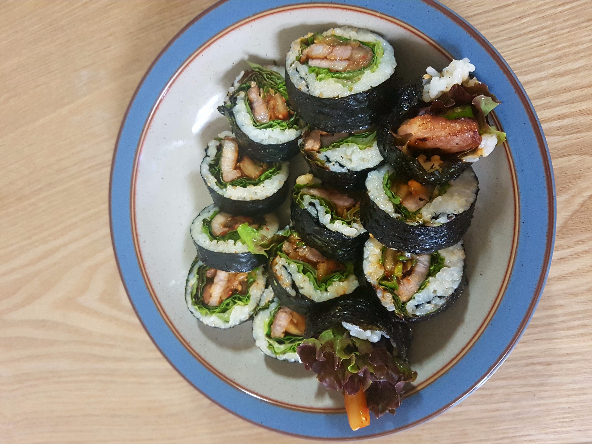 삼겹이에 상추 깻잎 깔고 청양고추 쌈장 볶은김지 넣어 말아봤습니다