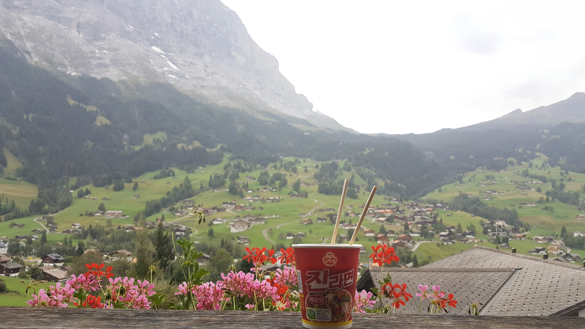스위스도착해서 발코니에서 컵라면 먹는중인데